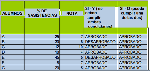 | =SI(Y(B8<=25,C8>=4),"APROBADO","DESAPROBADO") =SI(O(B8<=25,C8>=4),"APROBADO","DESAPROBADO") |