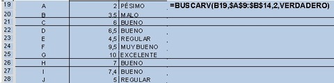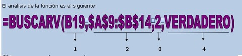 1. Indica la celda que contiene el dato que quiero comparar 2. Indica el rango de celdas que contiene la matriz de datos. En este caso se usó referencia absoluta, para poder completar automáticamente el resto de la segunda tabla 3. Indica la columna que se desea comparar; en este caso, es la segunda columna 4. El valor VERDADERO indica que se busca un valor aproximado. Si no se coloca este último elemento, se asume que es verdadero. Si se coloca FALSO, buscará el valor exacto |