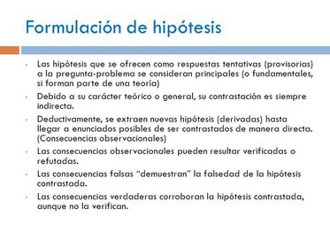 Formulación de Hipótesis - 2 Como se puede apreciar en el mapa anterior, la formulación de toda hipótesis está sujeta a determinado proceso de desarrollo, con lo cual se puntualiza, se rectifica, queda comprobada, o se refuta y se substituye por una nueva hipótesis. la formulación tiene tres fases: 1. PRIMERA FASE: Explicación de conjetura 2.SEGUNDA FASE: Análisis de la hipótesis y estudio de consecuencias , análisis de variables. 3. TERCERA FASE: Comparación de resultados analíticamente. La observación y la experimentación útiles para comparar.