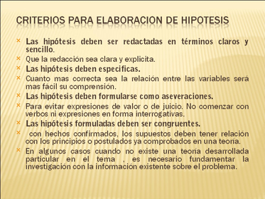 Funciones de las Hipótesis - 2 Las funciones de las hipótesis en una investigación son las siguientes: - De explicación inicial. - De estimulo para la investigación. - De fuente de metodología. - De criterios para valorar las técnicas de la investigación. - De principios organizadores. Dificultades en la investigación: - Falta de conocimiento o ausencia de claridad en el marco teórico: - Falta de aptitud para la utilización lógica del marco teórico. - Desconocimiento de las técnicas adecuadas de investigación para redactar hipótesis en debida forma.