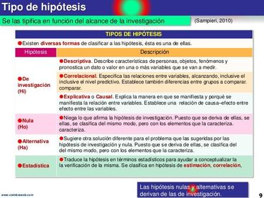 TIPOS DE HIPOTESIS - 2 TIPOS DE HIPOTESIS 1. De acuerdo a su origen 1.1. INDUCTIVAS: Nacen a partir de la observación y la experiencia. 1.2 DEDUCTIVAS: Tiene un proceso inverso de arriba abajo. 2. De acuerdo a la estadística 2.1 NULA (Ho) 2.2 ALTERNA (H1) **Al proceso de elegir entre Ho y H1 se conoce como comprobación de hipótesis. 3. De acuerdo a Rojas, Soriano, Sprintall, Schumutte, Sirois 3.1 Descriptivas que involucran una sola variable. 3.2 Descriptivas que involucran dos o m{as variables en forma asociada o covariada. 3.3 Relacionan dos o más variables en términos de dependencia 3.4 De la diferencia en la investigación post-facto. 3.5 Por igualdad. 3.6 Por simetria. 3.7 Por homología. 3.8 Por referencia. 3.9 Por analogía. 3.10 Enumeración proyectiva lineal 3.11 Hipótesis por reconstrucción complementaria. 3.12 Hipótesis por Oposición. 3.13 Hipótesis como secuencia cíclica.