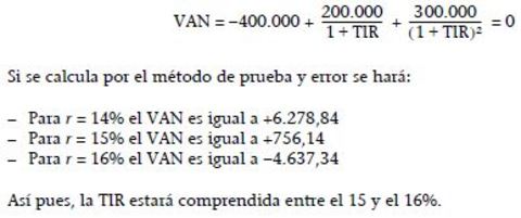 | Calcular el TIR de una inversión inicial de 400.000 euros de la que se obtendrán 200.000 de aquí a un año y 300.000 de aquí a dos. |