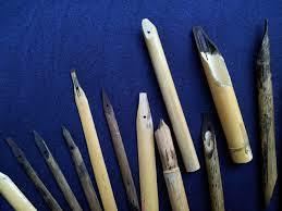 EL PINCEL El pincel tallado a bisel fue muy utilizado pero exigía grandes dotes caligráficas. | El cálamo, especie de junco tallado en punta, se usaba para escribir sobre papiro y pergamino y fue la herramienta más característica de la Edad Media y la Moderna. Dependiendo del afilado de su punta, la escritura adoptaba formas diferentes. |