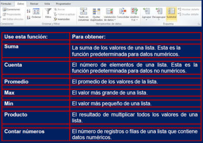 | Subtotales: Subtotales es una fórmula utilizada por Excel con la cual se puede resumir datos calculando valores de subtotales y de totales en una lista. | La tabla siguietes resume las funciones de la misma: |