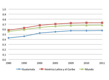 | IDH EN GUATEMA | Entre 1980 y 2011 el IDH de Guatemala creció en un 0.95% anual, pasándose del 0.428 hasta 0.574 de la actualidad lo que coloca al país en la posición 131 de 187 países para los que disponen datos comparables. |