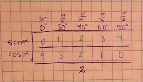 | Razones trigonométricas (son 6 y cuál es invertida a cuál) | Seno (sen) ----- Cosecante (csc) Coseno (cos)--------Secante (sec) Tangente (tan)-------Cotangente (cot) |