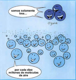 | "CAPA DE OZONO" El ozono es una forma de oxígeno cuya molécula tiene tres átomos, en vez de dos del oxígeno común. El tercer átomo es el que hace que el gas sea venenoso, mortal si se aspira una pequeñísima porción de esta sustancia. | |