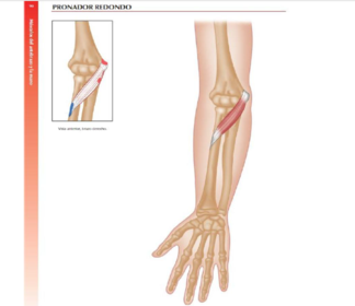 PRONADOR REDONDO O. P. humeral: cara anterior del epicóndilo medial del húmero/extremo inferomedial del húmero; P. cubital: ap. coronoides del cúbito I. Porción media de la superficie lateral del radio N. Mediano C6-7 A. mueve antebrazo en pronación, flexión codo | |