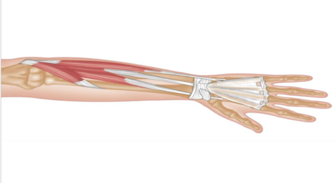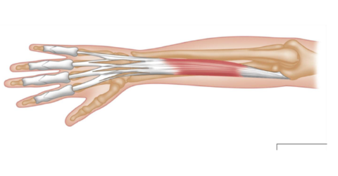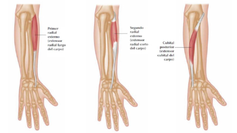 EXTENSORES DE LA MUÑECA (1er largo y 2do corto radial externo y cubital posterior) O. epicóndilo lateral del húmero (extremo inferolateral del húmero) I. superficie dorsal de los metacarpianos N. Radial C5-8 (1er, 2o radiales); ramo profundo del nervio radial (n. interóseo post.) C6-8 (cubital posterior) | |