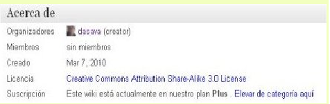 | ACERCA DE | Ahí aparecen los datos más significativos del wiki, como: organizadores miembros fecha de creación licencia Suscripción |