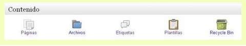 | CONTENIDO | Páginas: permite ver un listado de las páginas creadas con información sobre el último miembro que la editó y la fecha. Archivos: se visualiza los archivos subidos, con opción a eliminar, subir, editar etiquetados, ver revisiones y fecha. Etiquetas: muestra listado que se asignado a las páginas. Plantillas: muestra las plantillas que existen para poder usarlas y a la vez crear. Recycle Bin: es una papelera donde se almacena lo eliminado y se puede recuperar. |
