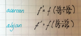 | Ecuación efecto Doppler | f': frecuencia del sonido percibida por el observador. f: frecuencia emitida por la fuente. |