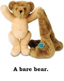 | Bare Bear | Bare (adj.): not covered (e. g., by clothes); naked. Bear (v.): (used in negative). If you don't bare someone or something, you dislike it very much; e. g. "I can't bare your girlfriend." Bear (v.): to endure; e. g. "she had to bear the pain all this time." Bear (v.): carry; e. g. "a warrior baring a sword." Bear in mind (v.): take into account and never forget; e. g. "We have to bare in mind who we ar and where we come from." Bare (n.): an animal. |
