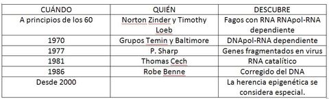 | Fechas y personajes característicos de la época dogmáticas. | 1958: Arthur Kornberg, descubre la DNApol (enzima que replica el DNA). P.N. 1959. 1959: Weiss y Gladstone, descubre la RNApol DNA dependiente (transcriptasa que transcribe DNA a RNA). 1961: Brenner, Jacob y Meselson, descubren el mRNA. P.N. 2002. 1962: Chapeville, identifica la función del tRNA en las proteínas. 1963: Nirenberg y Khorana, desarrollan el código genético formado por tripletes. P.N. 1967. |
