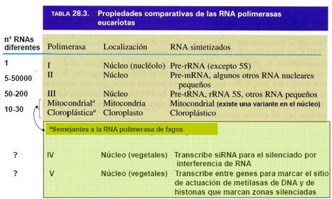 | Tabla de propiedades comparativas de las RNApol eucarióticas |