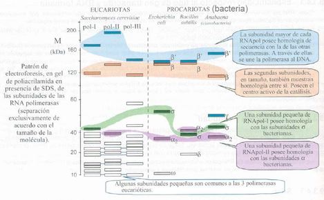 | Tabla comparativa de subunidades de las RNApol eucarióticas y la RNApol procarióticas. |