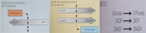 | ¿Qué ocurre en la fase de inversión de energía de la glucólisis? | Se sintetizan azúcares fosfato a costa de 2 equivalentes de ATP (que se convierte en ADP), y el sustrato de 6 carbonos se desdobla en 2 azúcares fosfato de 3 carbonos. |