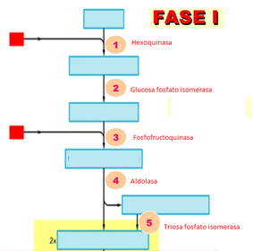 | Complete la siguiente imagen de la Fase de inversión de energía. (Fase I de la glucolisis). | 1. Glucosa 2. Glucosa-6-Fosfato 3.Fructuosa-6-Fosfato 4.Fructuosa-1,6-bifosfato 5.• Dihidroxiacetona fosfato 6.• Gliceraldehido-3-fosfato |