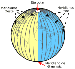 | Meridiano | Los meridianos son los semicírculos máximos del globo terrestre que pasan por los Polos Norte y Sur. Son líneas imaginarias que sirven para calcular el huso horario. Por extensión, son también los semicírculos máximos que pasan por los polos de cualquier esfera oesferoide de referencia. |
