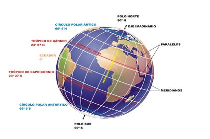 | trópicos: Son círculos paralelos al ecuador que esta en el hemisferio norte se llama trópico de cáncer y el hemisferio sur se llama trópico de capricornio | |