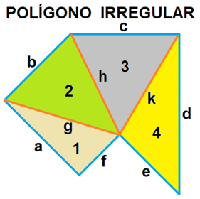 | Perímetro = a+b+c+d+e+f Área Total=Áreas 1+2+3+4 Á (1,2,3,4) = \(\sqrt {p·(p-a)·(p-b)·(p-c)}\) | |
