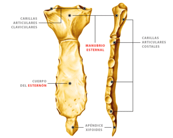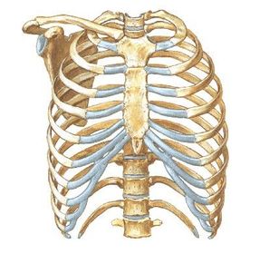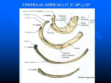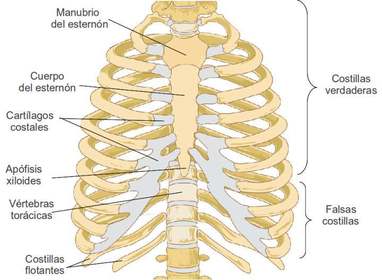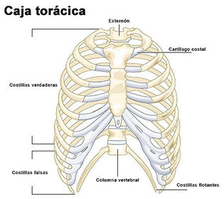 | Tipos de costillas | Costillas verdaderas (vertebrocostales 1-7), falsas (vertebrocondrales 8-10), flotantes o libres (11 y 12) |