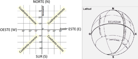 | COORDENADAS CARTESIANAS | ESPACIO TRIDIMENSIONAL (Z: CENTRO DE LA TIERRA Y POR LOS POLOS) (X: CENTRO DE LA TIERRA Y EL MERIDIANO PRINCIPAL) (Y: ÁNGULO DE 90° CON LOS OTROS DOS EJES) |