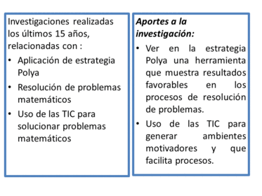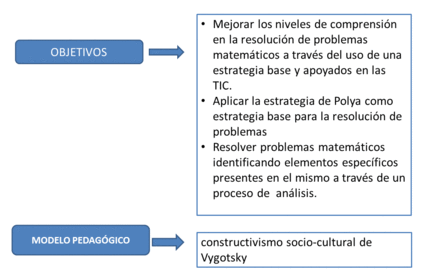 | OBJETIVOS ESPECIFICOS | • Identificar el nivel del proceso de resolución de problemas aritméticos de los estudiantes a través de la aplicación de una prueba diagnóstica. • Describir el proceso desarrollado por los estudiantes en la implementación de un ambiente de aprendizaje mediado por TIC en la resolución de problemas y a través del uso de la estrategia de Polya. • Evaluar el aporte del ambiente de aprendizaje en el proceso de resolución de problemas matemáticos en la población objeto de estudio. |