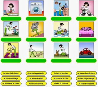 | Regarde la photo adjointe et réponds: 1- Ton père, aide-t-il à la maison? 2- Qui fait la vaisselle chez toi? 3- Qui range ta chambre? 4- Qui fait le linge chez toi? 5- Qui fait le repassage? 6- Qui époussette les meubles? 7- Qui fait le repas? 8- Qui met la table? 9- Que fais-tu à la maison? 10 - Qui sort la poubelle? | |