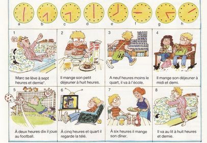 | 1- À quelle heure te lèves-tu? 2- À quelle heure prends-tu ton petit-déj.? 3- À quelle heure fais-tu la toilette et à quelle heure pars-tu pour le lycée? 4- Tu ranges ta chambre avant de partir? 5- Tu prends le bus pour aller au lycée? 6- À quelle heure as -tu la récré? 7- Combien d´heures étudies-tu chaque jour? 8- Tu rentres à quelle heure? 9- Tu regardes la télé ou tu surfes? 10 - À quelle heure fais-tu les devoirs? | |
