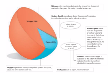 | Atmospheric gases and life | - Carbon dioxide (CO2) is essential for autotrophic oranisms to perform photosynthesis. - Oxygen (O2) is essential for the respiration of living things. Nitrogen (N) is essential for the construction of proteins. Water vapour (H2 O) forms part of the water cycle. |