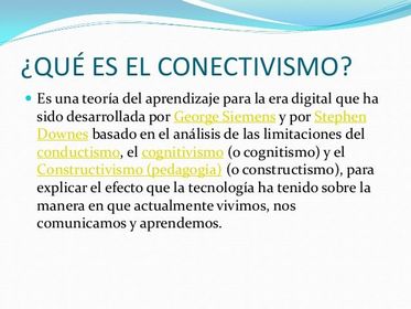 | El conectivismo, una teoría para la era digital “En su corazón, el conectivismo es la tesis de que el conocimiento está distribuido a lo largo de una red de conexiones, y por lo tanto el aprendizaje consiste en la habilidad de construir y atravesar esas redes”. Stephen Downes. | |