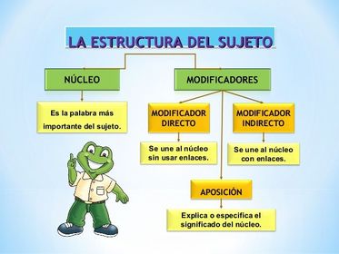 | está constituido por un sintagma nominal formado por: Núcleo (N): pronombres o sustantivos que concuerdan en número y persona con el verbo: el [perro] de Juan se llama "chuleta" | Determinante: [el] perro de Juan se llama "chuleta" Adyacente o C. del Nombre: el perro [de Juan] se llama "chuleta" |
