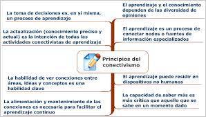 | El Conectivismo | La alimentación y mantenimiento de las conexiones es necesaria para facilitar el aprendizaje continuo. La habilidad de ver conexiones entre áreas y conceptos es una habilidad clave. |