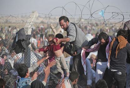 Está imagen me ha impactado mucho al ver como padres dejan en manos de personas desconocidas a sus hijos, sólo por llevarlos a un lugar seguro. En sus caras se puede apreciar a personas qie sufren por la situación que están viviendo. | |
