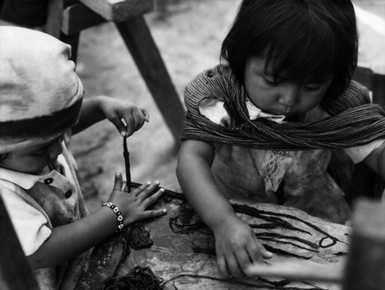 La sal se puso morena es otra imagen de un gran impacto discursivo, tomada en el interior de una escuela en algún municipio poblano (1989), se observa en la escena a cinco niños en el aula, en el pizarrón se logra leer: “El bidrio se calentó” y “La sal se puso morena”… Las prendas, las prendas, las actitudes corporales y la síntesis gráfica evocadora de mariana refiere a las enseñanzas culturales de las campañas de alfabetización; también señala esa capacidad de mimetismo del mundo de los adultos con el de los niños. Es una imagen que resume sin lugar a dudas los cambios que sufren y han sufrido nuestros pueblos, de la capacidad abrumadora de un modo de vida sincrético, aculturizador que se ha perpetuado en nuestras comunidades |