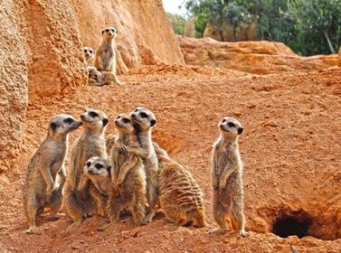 | FAUNA: Dentro de la sabana se encuentran insectos como los tábanos, un gran número de mamíferos como cebras, ciervos, elefantes, leones,chitas, hipopótamos, leopardos, ñus, etc. y reptiles como el cocodrilo. Existen especies tanto carnívoras como herbívoras que equilibran la cadena alimentaria de este ecosistema; es decir, todos dependen uno del otro para mantener un equilibrio natural. -jAGUAR | -Suricatas en la Sabana de Bioparc Valencia |