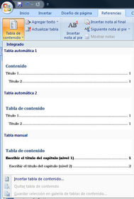 | Es un reflejo de la estructura de un documento y contiene los títulos de los temas y subtemas que forman el documento. | Tabla de contenido |