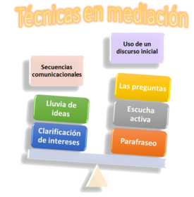 | Parafraseo | El mediador resume, precisa, aclara, cuantifica, profundiza o enfatiza algunas opiniones de las partes en las que quiere resaltar necesidades, opiniones o intereses. Es decir lo que la persona está diciendo, quitando la emoción y exponiendo sus ideas de forma objetiva. Cuando lo que acaba de decir una parte genera malestar en la otra, esta técnica lo aclara. Cuando la historia necesita ser re-situada es importante retomar la historia de las partes. De esta manera confirmamos la información recibida y reencuadramos la situación problemática. |