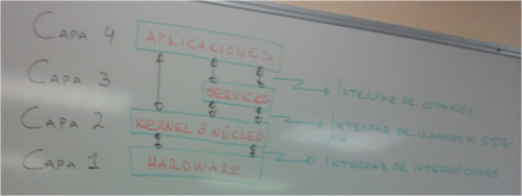 | Interfaz de interrupciones | Conumica a la capa de kernel con la capa de Hardware, compuesta por un conjunto servicios de interrupciones ofrecidas por el s.o. |
