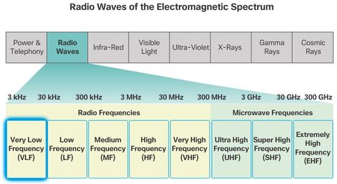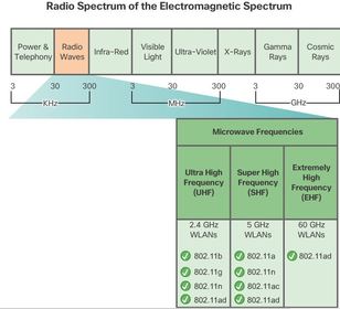 | Radio Frequencies Note: WLAN networks operate in the ISM 2.4 GHz frequency band and the UNII 5 GHz band. Wireless communication occurs in the radio waves range (i.e., 3 Hz to 300 GHz) of the electromagnetic spectrum. ** The radio waves range is subdivided into a radio frequencies section and a microwave frequencies section. Notice that WLANs, Bluetooth, cellular, and satellite communication all operate in the microwave UHF, SHF, and EHF ranges. | Wireless LAN devices have transmitters and receivers tuned to specific frequencies of the radio waves range. Specifically, the following frequency bands are allocated to 802.11 wireless LANs: * 2.4 GHz (UHF) - 802.11b/g/n/ad * 5 GHz (SHF) - 802.11a/n/ac/ad * 60 GHz (EHF) - 802.11ad |