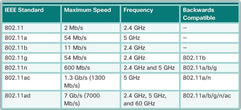 | * 802.11 - Released in 1997 and now obsolete, this is the original WLAN specification. ** IEEE 802.11a - Released in 1999. Because this standard operates at higher frequencies, it has a smaller coverage area and is less effective at penetrating building structures. * IEEE 802.11b - Released in 1999Devices implementing this standard have a longer range and are better able to penetrate building structures than devices based on 802.11a. ** IEEE 802.11g - Released in 2003,t is backward compatible with 802.11b. However, when supporting an 802.11b client, the overall bandwidth is reduced. | * IEEE 802.11n - Released in 2009,Typical data rates range from 150 Mb/s to 600 Mb/s with a distance range of up to 70 m (.5 mile) ** APs and wireless clients require multiple antennas using the multiple-input and multiple-output (MIMO) technology. MIMO use multiple antennas as both the transmitter and receiver to improve communication performance. Up to four antennas can be supported. The 802.11n standard is backward compatible with 802.11a/b/g devices. However supporting a mixed environment limits the expected data rates. |