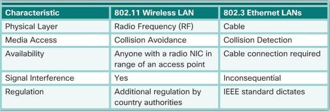 | Comparing WLANs to a LAN The IEEE has adopted the 802 LAN/MAN portfolio of computer network architecture standards. The two dominant 802 working groups are 802.3 Ethernet and 802.11 WLAN. * WLANs support hosts that contend for access on the RF media (frequency bands). 802.11 prescribes collision-avoidance (CSMA/CA) instead of collision-detection (CSMA/CD) for media access to proactively avoid collisions within the media. | |
