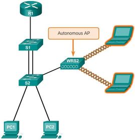 | Wireless Access Points 1.- Autonomous Aps - sometimes referred to as heavy APs, are standalone devices configured using the Cisco CLI or a GUI. Autonomous APs are useful in situations where only a couple of APs are required in the network. ** Optionally, multiple APs can be controlled using wireless domain services (WDS) and managed using CiscoWorks Wireless LAN Solution Engine (WLSE). Note: A home router is an example of an autonomous AP because the entire AP configuration resides on the device. | |