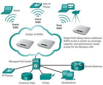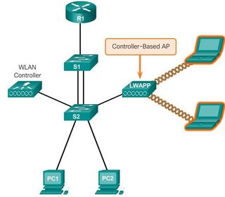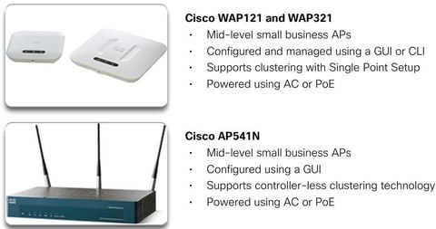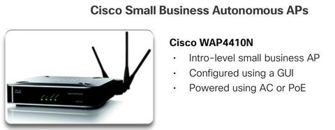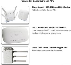 | Wireless Access Points 2. Controller-based APs - are server-dependent devices that require no initial configuration. Cisco offers two controller-based solutions. Controller-based APs are useful in situations where many APs are required in the network. As more APs are added, each AP is automatically configured and managed by a WLAN controller. * Note: Some AP models can operate in either autonomous mode or in controller-based mode. | |