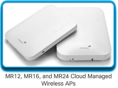 | MR12, MR16 & MR24 * Indoor, cloud managed 802.11n APs. * Self-configuring, plug-and-play deployment. * Self-healing, zero-configuration mesh. * The MR12 is for teleworker environments while the MR24 is for large enterprise deployments. * Cisco recommends using the MR12 for small branches and low-density deployments. The MR16 is recommended for organizations that are mobility-intensive. The MR24 is ideal for performance critical wireless LANs and high-density environments. | |