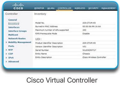 | Cisco Virtual Controller * Deployed on an x86 server that supports VMware ESXi 4.x or 5.x, 1 virtual CPU, 2 GB memory, 8 GB disk space, and 2 or more virtual Network Interface cards (vNICs). * Used to configure, manage, and troubleshoot up to 200 APs and 3000 clients. * Supports secure guest access, rogue detection for PCI compliance. | |