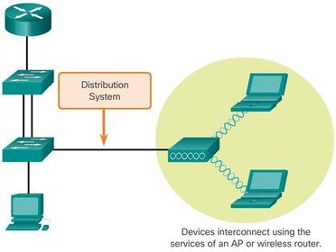 | 802.11 Wireless Topology Modes The 802.11 standard identifies two main wireless topology modes: 2. Infrastructure mode - When wireless clients interconnect via a wireless router or AP, such as in WLANs. APs connect to the network infrastructure using the wired distribution system (DS), such as Ethernet. | |