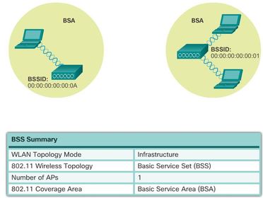 | Infrastructure Mode 1. Basic Service Set A BSS consists of a single AP interconnecting all associated wireless clients. Ej: The circles depict the coverage area within which the wireless clients of the BSS may remain in communication. This area is called the Basic Service Area (BSA). The Layer 2 MAC address of the AP is used to uniquely identify each BSS, which is called the Basic Service Set Identifier (BSSID). Therefore, the BSSID is the formal name of the BSS and is always associated with only one AP. | |