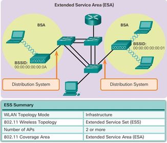 | Infrastructure Mode 2. Extended Service Set - When a single BSS provides insufficient RF coverage, two or more BSSs can be joined through a common distribution system (DS) into an ESS. Ej: an ESS is the union of two or more BSSs interconnected by a wired DS. Wireless clients in one BSA can now communicate with wireless clients in another BSA within the same ESS. Roaming mobile wireless clients may move from one BSA to another (within the same ESS) and seamlessly connect. * Each ESS is identified by an SSID and in an ESS each BSS is identified by its BSSID. For security reasons, additional SSIDs can be propagated through the ESS to segregate the level of network access. | |